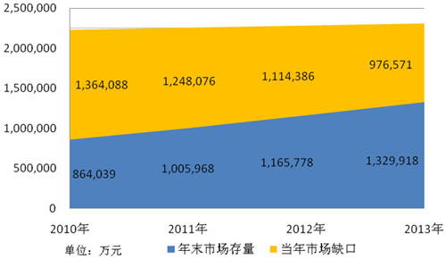 圖6 2010-2013年垃圾收集轉(zhuǎn)運(yùn)車市場(chǎng)缺口及年末市場(chǎng)存量