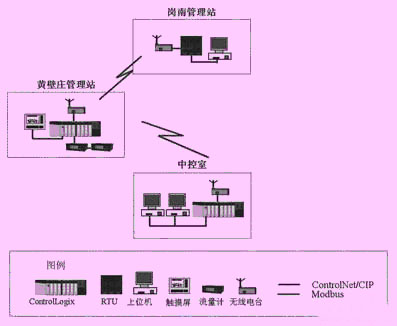 根據(jù)水廠生產(chǎn)工藝及管理要求,在系統(tǒng)設(shè)計(jì)時(shí)以原系統(tǒng)的站點(diǎn)結(jié)構(gòu)為依據(jù),保留原有的6個(gè)主站、9個(gè)子站。6個(gè)主站采用controllogix系列plc;9個(gè)子站采用compactlogix系列plc,廠區(qū)內(nèi)主干網(wǎng)以及主站與子站之間均采用controlnet冗余網(wǎng)絡(luò),上位機(jī)及觸摸屏均掛在controlnet冗余網(wǎng)絡(luò)上。為保證信號(hào)的穩(wěn)定和介質(zhì)的抗干擾性,在伴有高電壓及大電流的區(qū)段選用光纖作為網(wǎng)絡(luò)介質(zhì)。廠區(qū)中控室與崗南取水管理站和黃壁莊取水管理站數(shù)據(jù)傳輸采用無線通訊的方式實(shí)現(xiàn)。系統(tǒng)拓?fù)浣Y(jié)構(gòu)如圖1所示。