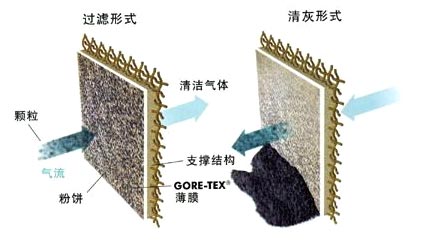 GORE—TEX®薄膜濾料及戈爾公司的技術和服務由美國戈爾公司于1975年發(fā)明和生產的GORE—TEX®薄膜濾料是迄今為止最完美地解決了過濾效率和清灰性能矛盾的一種濾料。該濾料的過濾表面復合了一層用“膨體”專利技術制成的多微孔、極光滑的膨體聚四氟乙烯(ePTFE)薄膜。由于膨體聚四氟乙烯(ePTFE)薄膜的纖維組織極為細密,結果使含塵氣體經過濾料后的粉塵排放量接近于零;由于膨體聚四氟乙烯(ePTFE)薄膜本身具有不粘塵、憎水和化學性能穩(wěn)定等特點,使薄膜濾料具有了極佳的清灰性能,結果使過濾阻力始終能保持在很低的水平,使處理氣流量始終保持在較高的水平,從而實現(xiàn)布袋除塵器的“表面過濾”。