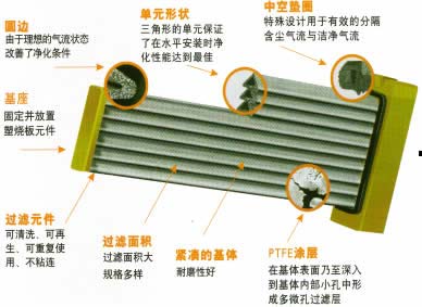 塑燒板過濾元件呈剛性波浪式多孔結(jié)構(gòu),是由多種高分子化合物粉體及特殊的結(jié)合劑嚴(yán)格配比后進(jìn)行鑄型燒結(jié),形成一個波浪式多孔母體作為燒結(jié)板過濾元件的基板,基板厚約4mm,其內(nèi)部形成大約30微米的均勻孔隙,然后通過特殊的噴涂工藝在母體表面的空隙里填充PTFE涂層,形成1~2微米左右的孔隙。