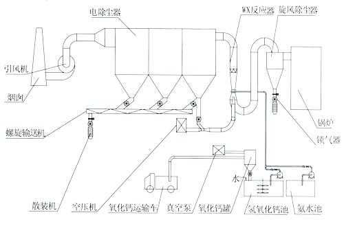 用旋風(fēng)除塵器預(yù)除60%以上的粉塵后的煙氣經(jīng)過WX反應(yīng)器時,在WX反應(yīng)器內(nèi)噴入吸收劑Ca(OH)2、從布袋除塵器強制返回的循環(huán)灰及氨水與廢氣之間產(chǎn)生很大的速度差,在懸浮狀態(tài)下產(chǎn)生劇烈的碰撞、摩擦和充分的混合,經(jīng)過旋流板時又使混合物在煙道內(nèi)以螺旋軌跡前進,從而強化了吸收、傳熱、傳質(zhì)過程。煙氣中的SO2與Ca(OH)2的吸收反應(yīng),生成半水亞硫酸鈣;煙氣中的SO2同時被循環(huán)灰表面較強的物理吸引力及異相化學(xué)力所吸附;煙氣中的SO2、HCl、NOx等酸性氣體與氨水發(fā)生氣--汽化學(xué)反應(yīng)生成各種銨鹽;這三種反應(yīng)終止物在煙氣的高溫下迅速蒸發(fā),過飽和結(jié)晶成顆粒狀,被后面的布袋除塵器收集。過量和未完全反應(yīng)的氫氧化鈣從電除塵器的端部收集后,一部分利用正壓密相氣力輸送方式再強制性循環(huán)到WX反應(yīng)器而再次利用,從而提高了Ca(OH)2利用率;另一部分進入下一道灰處理中。