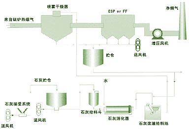 該系統(tǒng)有石灰漿制備、噴霧干燥塔和布袋除塵器(或靜電除塵器)三部分組成。該系統(tǒng)通過(guò)高速旋轉(zhuǎn)噴霧頭將石灰漿噴入噴霧干燥塔,與煙氣中酸性物充分接觸并起中和反應(yīng),利用煙氣中的余熱使石灰漿液中的水分蒸發(fā),脫硫后的煙氣經(jīng)除塵器除塵后排放。