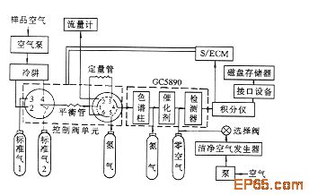 該系統(tǒng)主要包括:裝配有FID和HP19205A鎳催化劑管的HP5890(Ⅱ)型氣相色譜儀;HP3396Ⅱ型積分儀及HP樣品/外部事件控制器(S/ECM);帶有HP82169C HP-IL/HP-IB接口的HP9122C型磁盤驅(qū)動(dòng)器;用HP19238E閥加熱器保持恒溫的4路選擇閥和6口進(jìn)樣閥;保存于高壓鋁瓶和鋼瓶?jī)?nèi)的兩個(gè)標(biāo)準(zhǔn)氣、高純氮?dú)、高純氫氣;合成空氣發(fā)生器.圖1是系統(tǒng)工作流程的示意圖.