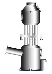 待處理煙氣首先從設(shè)備下端進(jìn)入煙氣均勻分配導(dǎo)流器、加速并進(jìn)行三元矢量動(dòng)力分配后,進(jìn)入煙氣氣動(dòng)力發(fā)生器,并在凈化室內(nèi)形成多級(jí)旋轉(zhuǎn)上升的紊流流場(chǎng),與同時(shí)從吸收液輸入調(diào)整器輸入的不穩(wěn)定凈化吸收液相碰,帶有氣動(dòng)力的煙氣高速、多向、反復(fù)、強(qiáng)烈的碰撞切割下流溶液,溶液被碰撞切割得愈來(lái)愈細(xì),氣液充分混合,形成一個(gè)氣、液、固三相物質(zhì)流組成的懸浮在凈化室中部的液體床,并持續(xù)不斷的高頻率相互傳質(zhì),使得煙氣中的有害物質(zhì)和粉塵被充分捕集、凈化、與吸收,從而達(dá)到凈化煙氣的目的。