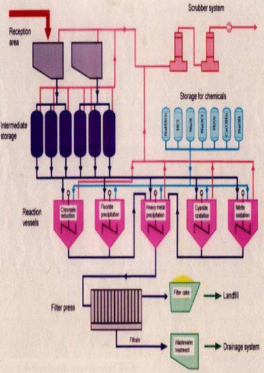 ![]() 1: 接收塔 2: 粗篩 3: 反應塔 4: 化料進口 5: 沉淀室 6: 板式壓濾機 7: 撇油 8: 污水處理 9: 污水排放 |