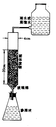 在玻璃管內(nèi)填裝經(jīng)0.5mm孔徑篩的固體廢物,以一定的流速(12mL/min)滴加雨水或蒸餾水,從測定滲漏水中有害物質(zhì)的流出時(shí)間和濃度的變化規(guī)律,推斷固體廢物在堆放時(shí)的滲漏情況和危害程度。