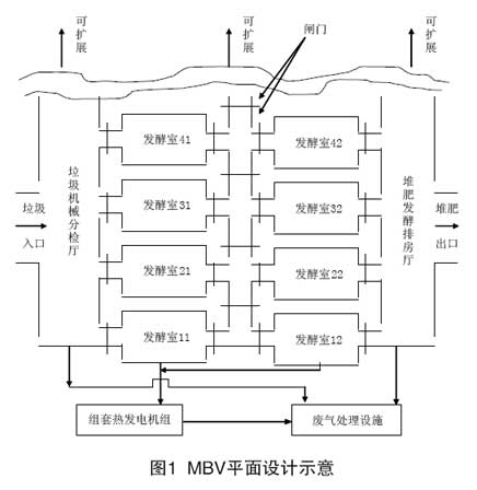 MBV環(huán)保設(shè)施由垃圾機(jī)械分檢廳、厭氧性發(fā)酵模塊、堆肥發(fā)酵排房廳、組套熱發(fā)電機(jī)組、廢氣處理設(shè)施5大部分組成,其平面設(shè)計(jì)示意見圖1。