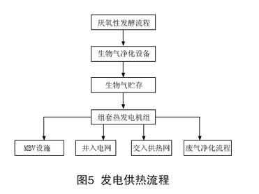 發(fā)電供熱流程的關(guān)鍵設(shè)備是比較昂貴的組套熱發(fā)電機(jī)組,其使用壽命與生物氣的凈化程度有關(guān)。生物氣中毒性和腐蝕性最大的氣體是硫化氫。發(fā)電供熱流程見圖5。