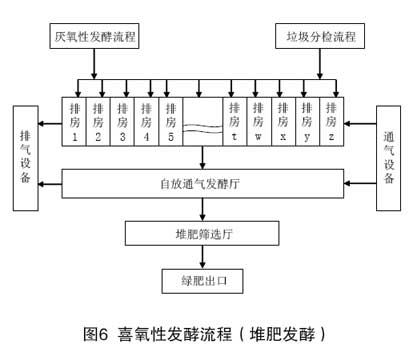 喜氧性發(fā)酵流程由發(fā)酵排房序列、自放通氣發(fā)酵廳、堆肥篩選廳、通氣設(shè)備和排氣設(shè)備5個(gè)部分組成。具體流程見圖6。