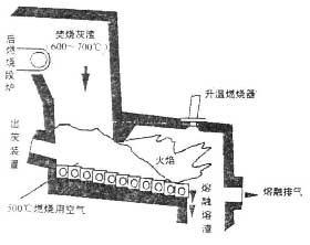 (2) 內(nèi)部熔融爐(圖2)。內(nèi)部熔融爐主要是以飛灰中殘留碳產(chǎn)生的燃燒熱作為處理灰渣的熱源。熔融處理過程主要分為進(jìn)料段、燃燒段、熔融段、熔渣排出段等階段,其中高溫灰渣(約含殘留碳10%~15%)進(jìn)入熔融爐中,并由爐床噴嘴送入500 ℃的預(yù)熱空氣,使殘留碳維持燃燒狀態(tài),燃燒段由電氣加熱器維持在800~900 ℃,熔融段約維持在1 300 ℃左右。