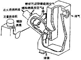 圖3 為傾斜型回轉(zhuǎn)式熔融爐示意圖,傾斜圓筒爐爐軸方向有啟動用點火器,而燃燒用空氣從數(shù)個噴口噴入。二次燃燒室與一次燃燒室的排氣相交,且二次燃燒室爐底有排水口,周圍呈傾斜以便熔渣易于排出。