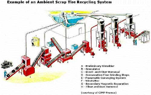 下圖顯示了一個(gè)典型的常溫報(bào)廢輪胎回收處理廠示意布局。這一過程被稱為常溫,原因是所有減小體積的步驟都是在常溫或接近常溫的環(huán)境中進(jìn)行的,即不需要通過冷卻來使橡膠變得易碎。