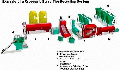 這一過程被稱為低溫,原因是利用液氮將完整輪胎或輪胎碎塊冷卻到-80℃以下。在這一溫度以下,橡膠會(huì)變得像玻璃一樣易碎,然后通過碾壓和研磨實(shí)現(xiàn)體積減小。這種大小的縮減有助于研磨以及鋼和纖維的析出,從而形成更加純凈的最終產(chǎn)品。