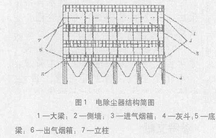 電除塵器是通過在除塵器本體的收塵極和放電極之間施加直流高壓,產(chǎn)生強(qiáng)烈的電暈放電,在兩極間形成大量正負(fù)離子,當(dāng)工業(yè)煙氣通入后,塵粒被荷電而成為帶電粒子,受電場力作用,在收塵極被捕集,然后通過振打機(jī)構(gòu)作用使被捕集的粉塵振落至灰斗收集輸送,從而完成氣體凈化過程。電除塵器的本體結(jié)構(gòu)主要由大梁、立柱、底梁、支撐梁、屋面板及側(cè)墻組成。大梁、立柱、底梁由不同型號的型鋼與板材組成, 支撐梁為橫梁與拉桿焊接而成, 屋面板和側(cè)墻由薄鋼板拼接而成。