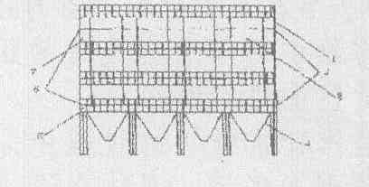 在某些工程上, 采用管式電除塵器,其結(jié)構(gòu)簡單,由一臺高壓電源,配上筒體電場(含電暈線) 清灰裝置與集灰斗構(gòu)成。在鍋爐超高壓管式電除塵器中,為了防止二次揚(yáng)塵,在煙囪內(nèi)部設(shè)置了“ 傘形罩”。“ 傘形罩” 由若干個圓錐筒疊加組成一個陽極管,圓錐與圓錐之間保留一定的間距,間距的大小依粉塵性質(zhì)、使用條件靈活確定。圓錐的錐角約為7 5 °左右,大于粉塵的安息角,使沉積在每個圓錐壁上的粉塵在重力和沖擊振動作用下落入下一圓錐的外壁上,通過外壁的錐度向筒體外排塵。結(jié)構(gòu)示意圖見圖2 。