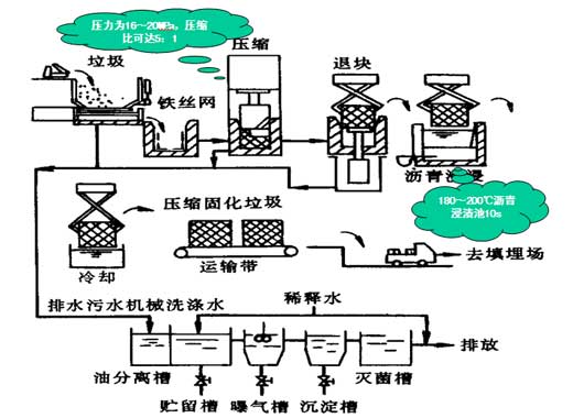 2、垃圾—墊有鐵絲網(wǎng)容器—壓縮機壓縮—瀝青浸漬池(180~200℃)—冷卻—皮帶輸送—垃圾填埋場。