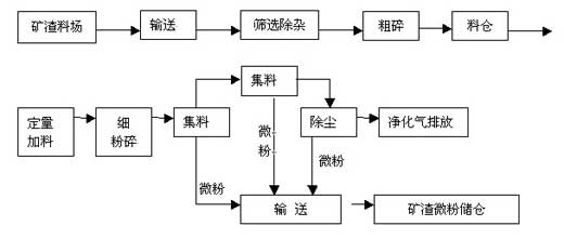 礦渣(水渣)堆料場的礦渣經(jīng)粉碎加工—— 礦渣微粉儲倉方案。 礦渣堆料場的礦渣經(jīng)輸送、篩選、除雜(鐵),進入粗碎機,粉碎成粗礦渣粉,粗礦渣粉經(jīng)定量加料器定量送入、細碎機進行粉碎;粉碎后 500目/25 μ m以上的 微粉經(jīng)二次集料送入礦渣微粉儲倉;集料后的氣粉混合物進入除塵器,經(jīng)除塵后的凈化氣排放,指標(biāo)低于國際規(guī)定標(biāo)準(zhǔn);除塵器搜集的 礦渣微粉也送入微粉儲倉。