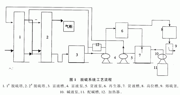 焦?fàn)t煤氣經(jīng)鼓風(fēng)、冷凝、硫銨、洗滌、粗苯工序冷卻、洗氨、洗苯、洗萘等后依次進(jìn)入1#、2#脫硫 塔,溫度為35~40℃,與pH值為8.5~9.2的脫硫液逆流接觸進(jìn)行脫硫的化學(xué)反應(yīng),脫除煤氣中H2S 后送入煤氣公司。從1#、2#脫硫塔流出的富液進(jìn)入富液槽,經(jīng)富液泵送往噴射再生器,再生后的貧 液經(jīng)液面調(diào)節(jié)器流至貧液槽,由貧液泵經(jīng)換熱器抽送至脫硫塔頂進(jìn)行噴灑。浮選出的泡沫自流入硫 泡沫中間槽、地下槽,然后由空壓氣打至硫泡沫高位槽,經(jīng)攪拌進(jìn)入熔硫釜做熔硫處理以生產(chǎn)硫磺。 焦?fàn)t煤氣進(jìn)脫硫塔前H2S含量一般為4~8g/m3,國(guó)家標(biāo)準(zhǔn)要求出口H2S低于20mg/m3。脫硫 系統(tǒng)工藝流程示于圖1。