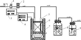 1-閥門;2-流量計;3-PID顯溫儀;4-PID控溫儀;5-U型石英管;6-亞磷酸鈣廢渣;7-加熱爐;8-次氯酸鈉吸收液;9-濃次氯酸鈉溶液