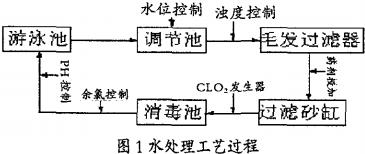 某公共游泳池的水處理工藝過程如圖1所示,該處理系統(tǒng)由毛發(fā)過濾器、水泵組、過濾砂缸和消毒器組成。游泳池的水通過溢水回流槽進入調(diào)節(jié)池,并通過調(diào)節(jié)池底部的管道進入毛發(fā)過濾器,毛發(fā)過濾器的作用是截留并去除水中的毛發(fā)及較長的纖維,然后進入水泵組,在過濾砂缸中進行過濾,過濾后的水再由二氧化氯發(fā)生器組成的消毒器中進行消毒,再進行余氯消毒,水質(zhì)的pH值控制,最終從池底的流人泳池中。