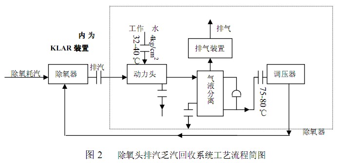 除氧頭乏汽排汽經(jīng)KLAR裝置抽吸后,與工作水混合加熱,然后經(jīng)分離裝置排出氧氣,同時經(jīng)過調(diào)壓裝置,將熱水回輸?shù)匠跛到y(tǒng)中。冷凝水及乏汽熱能100%回收。