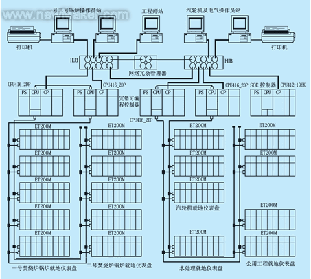 本控制系統(tǒng)由西門子400系列的CPU416-2組成雙機熱備,進行數(shù)據(jù)冗余,300系列分布式I/O組成雙冗余的DP總線,是性價比極高的集散控制系統(tǒng),在今后的各種環(huán)保電廠主機控制及大型發(fā)電機組的輔機控制領(lǐng)域中具有極大的推廣價值。