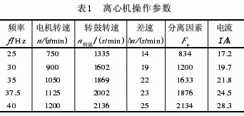 根據(jù)實(shí)際的操作狀況,通過對(duì)離心機(jī)的運(yùn)行及操作參數(shù)進(jìn)行了核算并進(jìn)行了調(diào)整,要求在平穩(wěn)運(yùn)行的基礎(chǔ)上盡量提高離心機(jī)的工作轉(zhuǎn)速,調(diào)節(jié)電源的頻率要求在25Hz以上,運(yùn)行電流不超過30A(見表1),盡量提高分離因素。