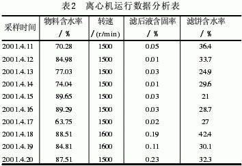 離心機(jī)的處理量按懸浮液計(jì)為5~10m3·h-1,單臺(tái)軟管泵的額定流量為6m3·h-1。根據(jù)實(shí)際運(yùn)行操作,考慮到物料變化的因素,運(yùn)行三臺(tái)離心機(jī),配套運(yùn)行三臺(tái)軟管泵操作比較穩(wěn)定,處理量控制在6m3·h-1左右,濾后液的澄清度、濾渣的含水率都比較理想,又避免了管線的堵塞及離心機(jī)轉(zhuǎn)鼓堵塞現(xiàn)象,提高了離心機(jī)的平穩(wěn)運(yùn)行率,改善了水力旋流沉淀器的處理效果。
