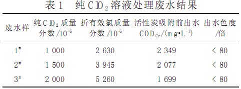 (1)采用穩(wěn)定性ClO2(純ClO2)溶液處理。穩(wěn)定性ClO2溶液經(jīng)活化劑(鹽酸)活化后加入到廢水中,其處理結(jié)果見表1。