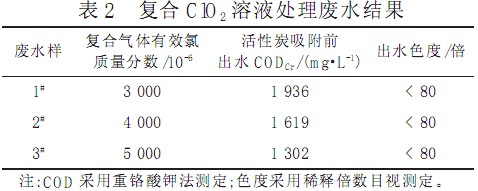 (2)采用復(fù)合ClO2氣體處理。華特908發(fā)生器現(xiàn)場制備復(fù)合ClO2氣體溶液,直接投加到廢水中,其處理結(jié)果見表2。