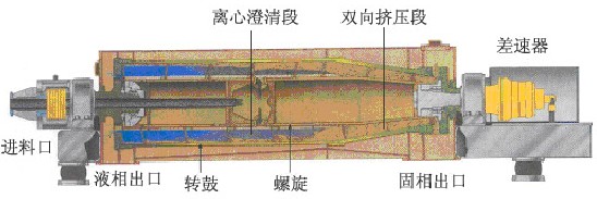 臥螺離心機(jī)是依靠固液兩相的密度差,在離心力場(chǎng)的作用下,加快固相顆粒的沉降速度來實(shí)現(xiàn)固液分離。見圖: