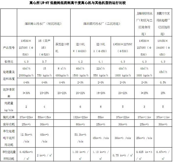 (4)深圳南山污水處理廠最早使用進(jìn)口芬蘭帶機(jī),2000年招標(biāo)使用了某公司引進(jìn)法國(guó)堅(jiān)納公司技術(shù)生產(chǎn)的D5 離心機(jī),處理能力 15m3/h,未能達(dá)到招標(biāo)要求的 26m3/h。 2002 年改造時(shí)通過公開招標(biāo)中標(biāo)了上海市離心機(jī)械研究所有限公司生產(chǎn)的液壓低能耗高干度離心機(jī)LW530×2270NY及成套設(shè)備,當(dāng)進(jìn)料濃度為4~6.5%時(shí),處理量達(dá) 40m3/h,泥餅含固率可達(dá) 34%,耗藥量<2kg/tds。由于該設(shè)備的優(yōu)異性能,深圳水務(wù)(集團(tuán))有限公司分別于2004年9月、 2006年6月通過招標(biāo)再次訂購(gòu)了上海市離心機(jī)械研究所有限公司的液壓低能耗高干度離心機(jī)LW530×2270NY及成套設(shè)備用于南山及濱河污水處理廠。