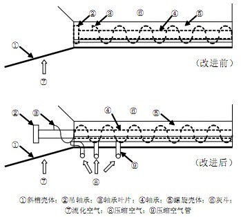 在實際脫硫工程中,對除塵器底部螺旋輸送機(jī)進(jìn)行了改進(jìn)(如圖3)。螺旋輸送機(jī)的吊軸承被延長,伸出接口法蘭,懸掛在流化斜槽的灰斗壁上,同時將螺旋葉片也伸出接口法蘭并與吊軸承相隔一段距離,且螺旋葉片高于流化斜槽上的流化布,以避免割傷。由于部分螺旋葉片設(shè)置在流化斜槽上,輸送的粉料就可以被完全推到流化斜槽上,并在流化風(fēng)的作用下輸送,防止了物料的堆積結(jié)塊。同時,還在螺旋尾端壁上加入壓縮空氣,進(jìn)風(fēng)導(dǎo)管在螺旋電機(jī)電流增大時,開啟壓縮空氣,有助于將結(jié)塊物料打碎,輔助物料輸送。工程應(yīng)用表明,這一改進(jìn)十分有效。