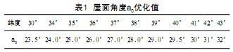 通過對屋面角度a0的研究表明,采光總量的多少與采光屋面形狀無關(guān),而是由透明屋面最高點到其前棚著地點處的直線與水平地面的夾角a0來決定。由于不同地區(qū)接收的太陽輻射能不同,經(jīng)理論推導(dǎo),在北緯33°~ 43°地區(qū)的南屋面角度a0優(yōu)化值如表1所示。