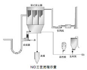 從鍋爐空氣預(yù)熱器出來的煙氣溫度約為150℃。若無預(yù)除塵器,則煙氣直接經(jīng)彎曲煙道進入矩形反應(yīng)器,與均勻混合在增濕循環(huán)灰中的吸收劑Ca(OH)2發(fā)生反應(yīng)。在降溫和潮濕的條件下,煙氣中的SO2、SO3、HCl、 HF等與吸收劑在1~1.5s內(nèi)發(fā)生反應(yīng),生成亞硫酸鈣、硫酸鈣、氯化鈣和氟化鈣等。隨后,煙氣將反應(yīng)后的干燥的脫硫循環(huán)灰?guī)牒笾玫拇匠龎m器或電除塵器中,固體物料就從煙氣中分離出來,落入灰斗,由輸送設(shè)備輸送至混合器。同時,混合器中不斷加入經(jīng)消化器消化過的新鮮生石灰。在混合器中,循環(huán)物料經(jīng)增濕、攪拌混合后,含濕率從2%提高到5%左右,在流化和負壓的作用下進入反應(yīng)器進行再次循環(huán)。循環(huán)倍率達30~ 150倍。在高的循環(huán)倍率下,吸收劑的利用率在95%以上。凈化后的煙氣溫度高出露點10℃~15℃,無須再加熱和防腐,可經(jīng)引風(fēng)機直接排入煙囪排放。NID工藝流程見下圖。