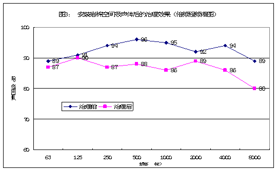 從以上數(shù)據(jù)的測(cè)試和分析可以看出,平板型和豎板型結(jié)合的巖棉空間吸聲體對(duì)250hz、500hz、1000hz段的吸聲效果非常顯著。 250(hz)段降噪7 .0db(a);500(hz)段降噪8.0db(a);1000(hz)段降噪9.0db(a);2000(hz)段降噪 3.0db(a)。對(duì)這類噪聲的峰值進(jìn)行了有效削減。實(shí)測(cè)后,站房內(nèi)a聲級(jí)噪聲降低到89.0 db(a)。降噪量達(dá)到6.5 db(a)。