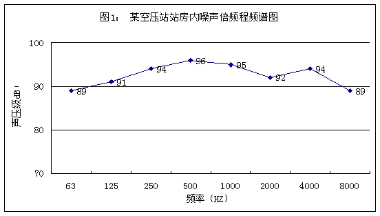 下面是某廠空壓站站房內(nèi)的實(shí)測(cè)噪聲數(shù)據(jù)和實(shí)測(cè)頻譜圖?諌赫镜脑肼曃:χ饕性谥懈哳l上,因此對(duì)人的聽覺和現(xiàn)場(chǎng)的作業(yè)環(huán)境有較大的影響。