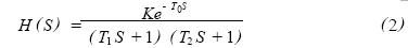 式(1)中u(k)為采樣時(shí)刻k的輸出值; e(k)為采樣時(shí)刻k的偏差值; e(k-1)為采樣時(shí)刻(k-1)時(shí)的偏差值?刂破鞯谋壤⒎e分、微分常數(shù)的選擇應(yīng)根據(jù)被控對象的模型和要求的最優(yōu)目標(biāo)函數(shù)決定, 控制參數(shù)對控制性能是至關(guān)重要的。由于除塵系統(tǒng)是一個(gè)變化較復(fù)雜的激振系統(tǒng), 沒有現(xiàn)成的數(shù)學(xué)模型可以參考。該系統(tǒng)采取的方法是:通過計(jì)算機(jī)仿真尋優(yōu),先求出最佳的參數(shù)范圍,然后在實(shí)際運(yùn)行中通過現(xiàn)場調(diào)節(jié)來達(dá)到最佳參數(shù)的選取。計(jì)算機(jī)仿真尋優(yōu)是通過給定一個(gè)激勵(lì)電流的階躍信號,進(jìn)口溫度呈S形的上升曲線,可以用一個(gè)慣性加時(shí)滯的模型來近似描述這一系統(tǒng),傳遞函數(shù)為: