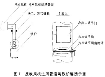 將原焊制的鐵爐布置在除塵器反吹風(fēng)機(jī)進(jìn)風(fēng)處,其出口管道和反吹風(fēng)機(jī)進(jìn)風(fēng)管道直連。要求鐵爐有效內(nèi)徑Φ700mm, 出口管道有效內(nèi)徑Φ250mm( 和反吹風(fēng)機(jī)進(jìn)風(fēng)管道內(nèi)徑相等) , 且在出口管道易操作處設(shè)置熱風(fēng)調(diào)節(jié)閥和冷風(fēng)口調(diào)節(jié)門。方案布置見圖1。在使用中根據(jù)濾袋的濕度調(diào)整爐火的大小及熱風(fēng)調(diào)節(jié)閥和冷風(fēng)口調(diào)節(jié)門的大小, 達(dá)到預(yù)防結(jié)露、烘干濾袋的合適的清灰溫度。