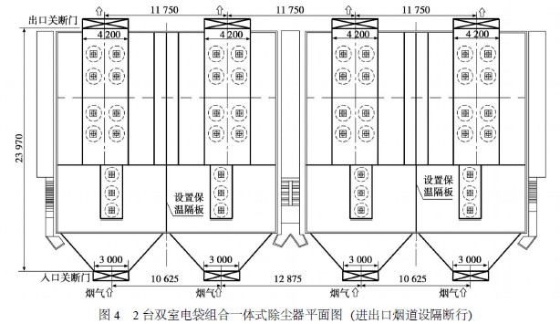 純布袋除塵器及電袋組合分體式除塵器的過濾倉室是能實現(xiàn)在線檢修換袋的過濾單元, 電袋組合一體式除塵器由于其進氣與電除塵區(qū)連通, 過濾倉室無法實現(xiàn)在線檢修換袋, 需要通過在除塵器進出口煙道上設置隔斷門進行離線檢修換袋, 切除1/ 4列除塵單元并需要鍋爐降負荷(降25 %的負荷)運行。對單機容量300 MW , 600 MW 的機組來講, 鍋爐降25 %的負荷(降75 MW , 150 MW 負荷) 運行, 電廠的經(jīng)濟性要受到影響。圖4 為1 臺300 MW 機組配套電袋組合一體式除塵器的平面圖。