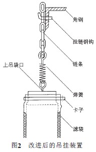 改進(jìn)吊掛裝置見(jiàn)圖2。 其工作原理仍是利用彈簧拉伸后產(chǎn)生的彈性形變力將鏈條與上吊袋口張緊。安裝時(shí),以向上拉力拉起鏈條通過(guò)彈簧產(chǎn)生的拉伸回彈力而繃緊濾袋,達(dá)到一個(gè)合適的力度時(shí),將鏈條鉤環(huán)卡掛在掛鉤上.掛鉤與角鋼焊成一體。 同樣情況,角鋼的兩端通過(guò)螺栓聯(lián)接或焊接固定在除塵器的上殼體上作為吊掛支架。