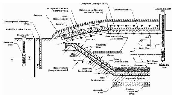 該圖提供了在填埋場設(shè)計中可能考慮到的土工合成材料的諸多應(yīng)用,當然,并非每個填埋場都要用到圖中所有部分。
