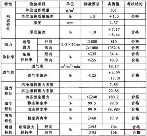 表1 PPS濾料物理機(jī)械性能實(shí)測結(jié)果