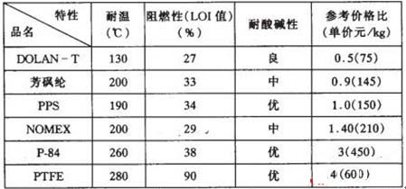 PPS、DOLAN-T、芳砜綸、NOMEX、P-84和PTFE的耐溫性能、阻燃性、耐酸堿性及價格作比較,結(jié)果見表4。