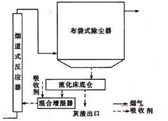作為吸收劑投入的Ca(OH)2與從除塵器濾下的大量的循環(huán)灰相混合進(jìn)入增濕器,并以流化風(fēng)力動力借助煙道負(fù)壓的引力導(dǎo)入煙道式反應(yīng)器。大量的脫硫循環(huán)灰進(jìn)入反應(yīng)器后,反應(yīng)器中Ca(OH)2的濃度很高,有效鈣酸比很大,且加水消化制得的新鮮Ca(OH)2具有很高的活性,因此能確保較高的脫硫效率。該方法省去了噴霧干燥法復(fù)雜的制漿系統(tǒng),同時循環(huán)灰又有極好的流動性,克服了普通半干法反應(yīng)器中可能出現(xiàn)的粘壁問題。