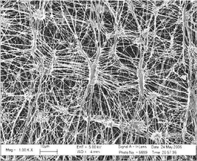 圖5是中材科技股份有限公司公司生產(chǎn)的濾膜的掃描電鏡照片。從圖中可以看出,濾膜的孔徑非常小,在1微米以下,這樣就確保了過濾精度。而目前市場上的覆膜濾料,膜的孔徑都比較大,達(dá)幾個微米,甚至更大。