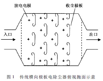 傳統(tǒng)電除塵器的收塵極板與氣體的進(jìn)入方向平行,氣體的驅(qū)進(jìn)速度僅由氣體的慣性力決定,為了達(dá)到除塵效率,需要增加電場(chǎng)的長(zhǎng)度,浪費(fèi)了大量的鋼材。而橫向極板電除塵器是一種新型的除塵器,收塵極板與氣體運(yùn)動(dòng)方向垂直,使電場(chǎng)力和慣性力方向一致,氣體的驅(qū)進(jìn)速度由電場(chǎng)力和慣性力共同決定,增大了驅(qū)進(jìn)速度,提高了除塵效率,改善電除塵器性能,減少了資源的浪費(fèi)。同時(shí)極板的橫向布置還可以起到勻化氣體分布的作用。由于這項(xiàng)技術(shù)在流場(chǎng)方向,提高離子的輸出濃度等方面技術(shù)尚不成熟,因而需要進(jìn)一步研究。
