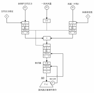 一次風量指令在進行處理時,需要考慮燃料的特性及負荷變化情況,燃料不同時,助燃空氣量會有所不同。負荷不同一次風量占總風量的比例也會發(fā)生變化,同時,如果床溫偏高,增加一次風量;如果床溫偏低,則減小一次風量。當床溫偏高,增加了一次風量,則總風量相應增加,總風量調(diào)節(jié)回路輸出減小,則一次風、二次風指令減小,最后達到平衡時,一次風增加,二次風減小,從而達到調(diào)節(jié)床溫的目的。下圖為鼓風機變頻調(diào)節(jié)的控制方案,其它MCS方案不再贅述。
