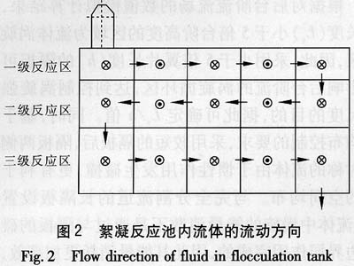 試驗(yàn)裝置包括混合器、絮凝反應(yīng)池、沉淀池。采用菱形翼片隔板絮凝反應(yīng)池,外形呈矩形,為碳鋼防腐材質(zhì),反應(yīng)區(qū)每格內(nèi)置翼片隔板(不銹鋼材質(zhì)),反應(yīng)池尺寸為L×B×H=1000 mm×500 mm×2250 mm,有效深度為1650 mm。裝置的設(shè)計(jì)處理量為5 m3/h,混合時(shí)間為5 s、反應(yīng)時(shí)間為12 min。絮凝反應(yīng)池設(shè)計(jì)為三級(jí)反應(yīng)區(qū),各級(jí)設(shè)計(jì)流速分別為0.09、0.07、0.05 m/s,每級(jí)反應(yīng)區(qū)內(nèi)放置不同結(jié)構(gòu)參數(shù)的菱形翼片隔板絮凝設(shè)備。圖2為絮凝反應(yīng)池內(nèi)流體的流動(dòng)方向。