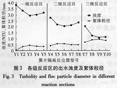 分別采用Y1~Y5型、Y4~Y8型和Y7~Y10型翼片隔板反應(yīng)器作為一級(jí)、二級(jí)和三級(jí)反應(yīng)區(qū)內(nèi)的絮凝反應(yīng)設(shè)備,在相同操作參數(shù)下進(jìn)行絮凝試驗(yàn),以分別確定出三級(jí)反應(yīng)區(qū)的最優(yōu)絮凝設(shè)備尺寸,試驗(yàn)結(jié)果見圖3。